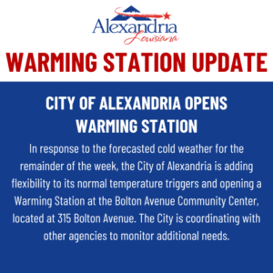 Alexandria, Louisiana – In response to the forecasted cold weather for the remainder of the week, the City of